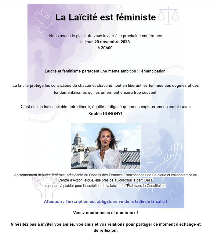• Conférence “La Laïcité est féministe”, le 20 novembre 2025 à Waterloo (Belgique)