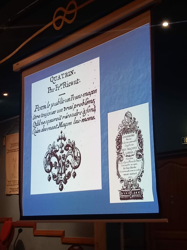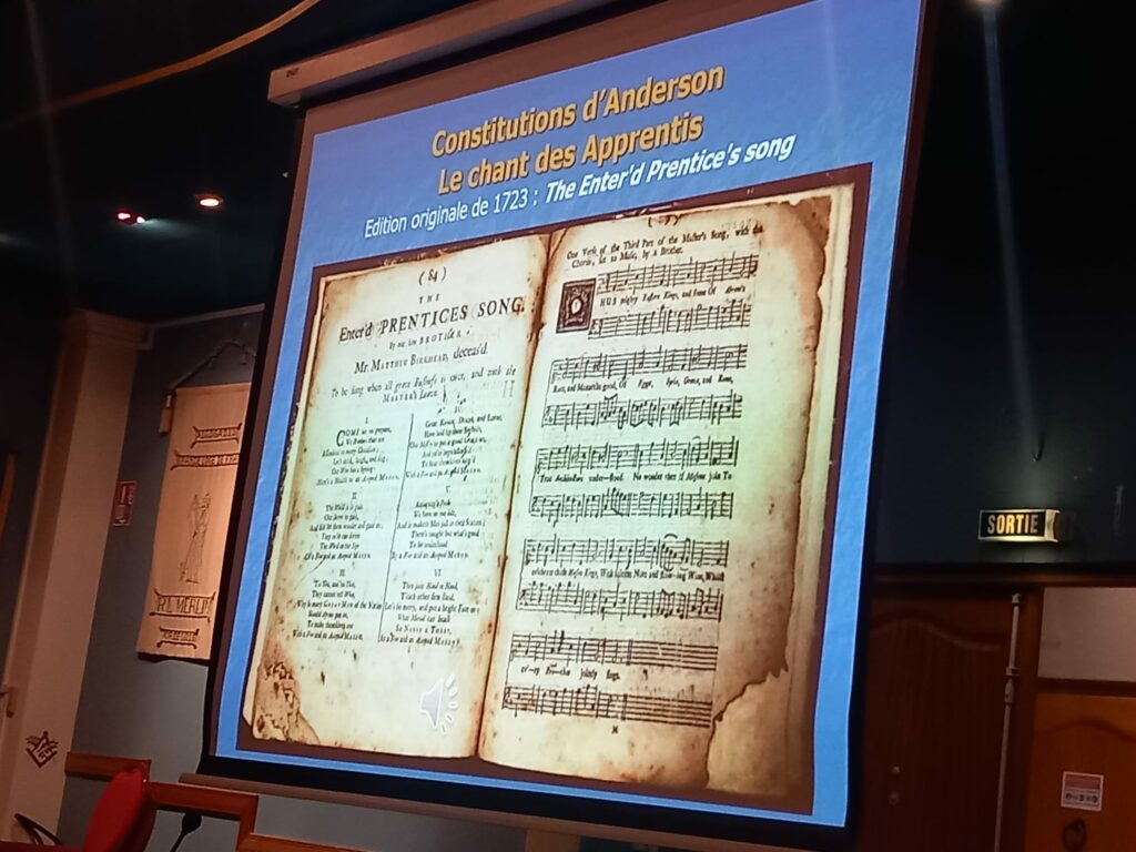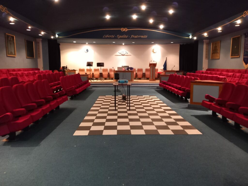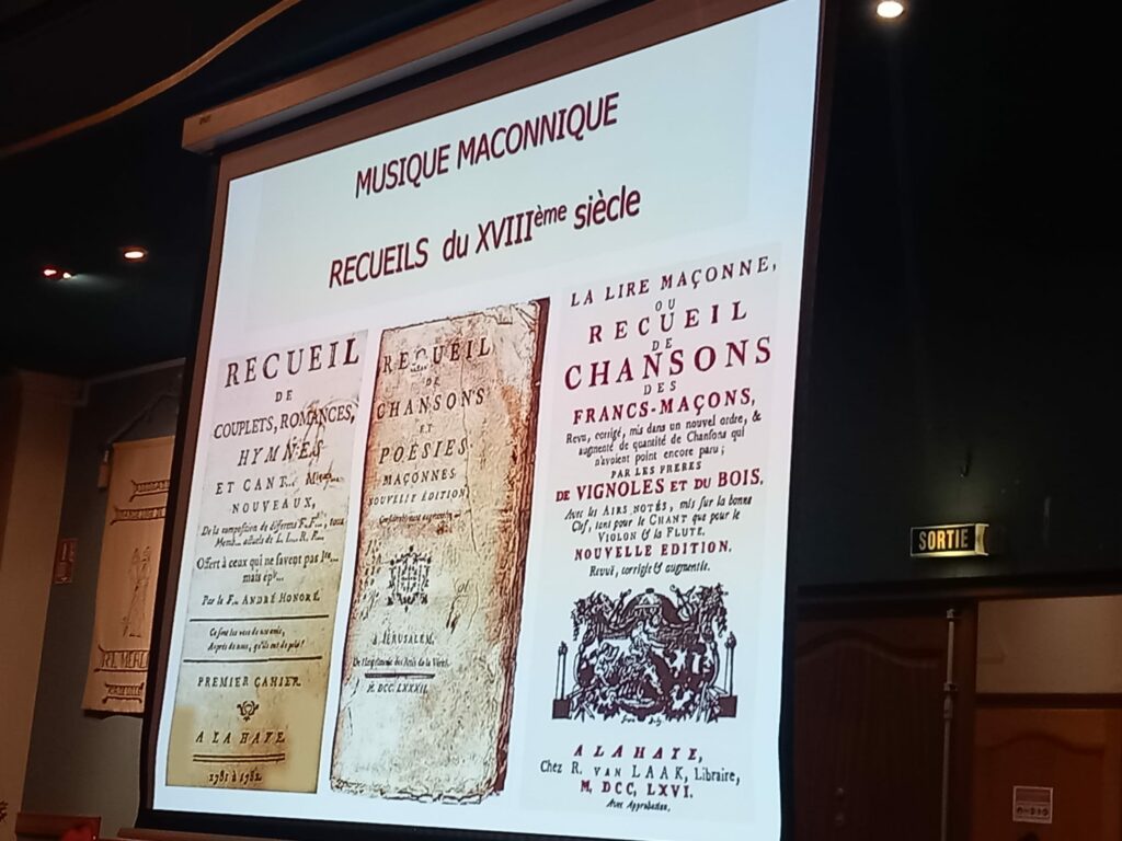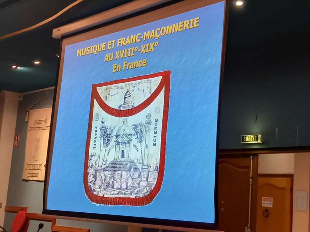 Nous avons été chaleureusement et fraternellement accueillis par les Frères présents à l’entrée. Après ces instants de convivialité, ils nous ont invités à nous diriger vers le Grand Temple, où allait débuter la conférence consacrée au patrimoine musical maçonnique
