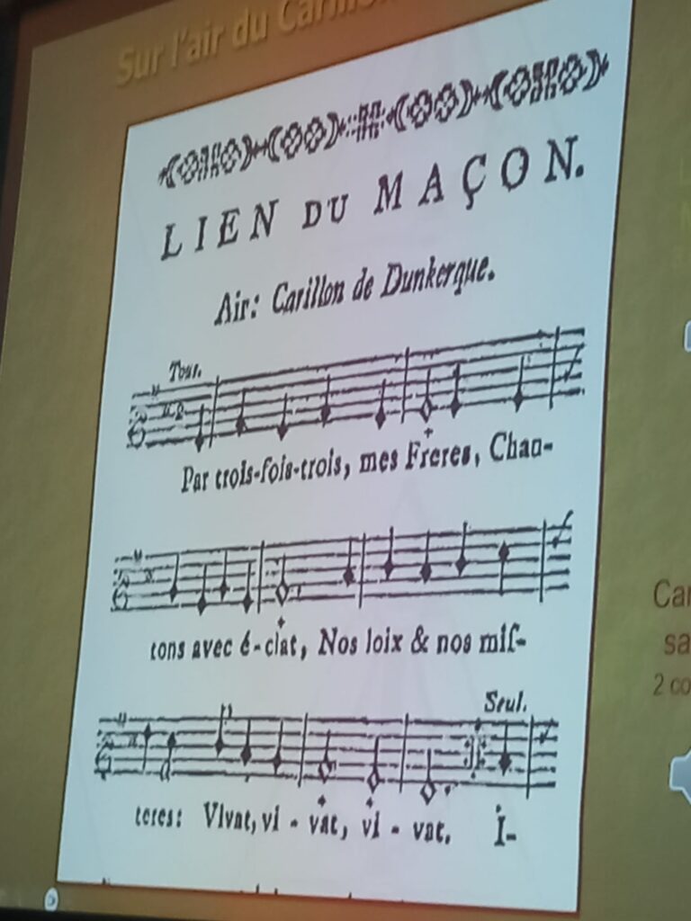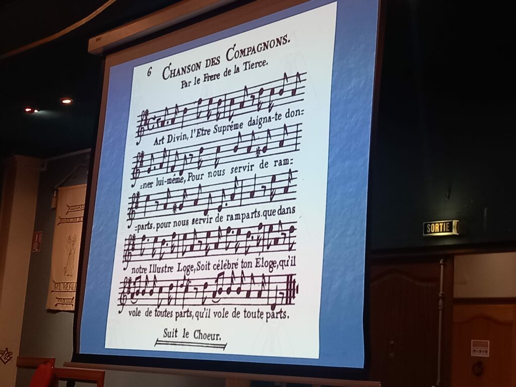 À la fin de la conférence, les frères conférenciers ont eu la délicate attention d’inviter l’ensemble de l’auditoire , composé à la fois de « profanes » et de maçons , à se rendre à l’Orient pour entonner, avec plus ou moins de justesse mais beaucoup de ferveur, le traditionnel ” Chant des adieux “.